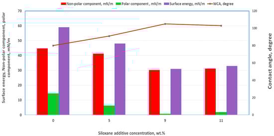 The results presented in Table 3 and Figure 4 show that the surface energy of the pigment-coated surfaces was reduced as the concentration of additive was increased. Both the polar and dispersive components of the surface energy were found to have reduced, especially at additive concentrations higher than or equal to 9 wt.%. The contact angle between the non-polar liquid, DIIM, and the modified coated surface increased significantly when high concentrations of additive had been incorporated into the formulation. For the control pigmented coated (Control 2) surface, the contact angle of DIIM was approximately 30°, indicating its non-polar nature, while incorporation of 11 wt.% additive resulted in a low surface polarity, with contact angle of 56° being recorded for DIIM. The results show that coatings containing 5, 9 and 11 wt.% additive displayed higher degrees of surface hydrophobicity compare to that of the Control 2 coating. These changes in the surface properties may suggest that the self-assembly took place on the surface because of the polymerization-induced segregation of the siloxane additive. Self-assembly polymerization-induced phase separation has been reported earlier when the additive became insoluble during polymerization [].