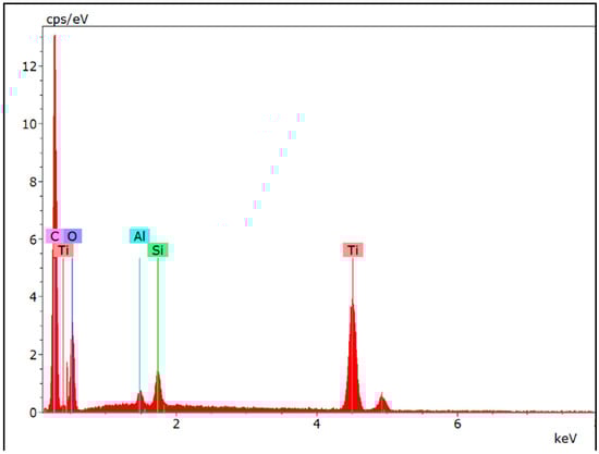 The surface chemical composition for the Control 2 coating and the various coatings prepared using different concentrations of TEGOMER® M-Si 2650, analyzed by XPS, are summarised in Table 4. These results show that the greater the concentration of additive, the greater the amount of silicon (siloxane) that is present on the surface. Furthermore, nitrogen (from polyester-melamine resin) was not detected on the surface for the coating containing the 11 wt.% of siloxane additive, which demonstrates the significant presence of siloxane. The results are consistent with the observed higher water contact angles and the relatively non-polar surface behavior of this coating composition. The surface chemistry results also highlighted that for coatings containing the titanium dioxide pigment, a smaller amount of melamine being present at the surface (e.g. lower atomic percentage of nitrogen). Furthermore, at the same concentration of siloxane additive (5 wt.%), greater amounts of siloxane appeared to migrate to the surface on the coatings containing the pigmented polyester-melamine coating than was observed for the non-pigmented coating. This may suggest a synergistic effect taking place between the passivated titanium dioxide, causing the surface segregation of the siloxane copolymer. EDS analysis of the coating (Figure 5) showed the presence of titanium and aluminum, confirming that the titanium dioxide pigment is present at approximately few microns below the surface of coating. The ratio of Al to Ti is around 8.
