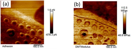 The greatest measured modulus in the water environment was found to be comparable to the elastic modulus of PDMS [], whereas the measured moduli in the presence of air were comparable to those of stiff polymers such as polyester and polystyrene []. A similar trend was observed for the adhesion force, which was approximately 10 times lower in the water environment (~0.6–1 nN) compared to that obtained in the air (~5–9 nN) (see the adhesion map profile, Figure 8d).