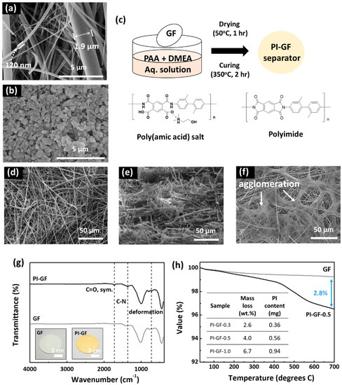 PI was in marked contrast to PP in that it had high thermal stability (>500 °C) and wettability to electrolyte solvent. PI was introduced into GF by simple dipping into aqueous PAA solution and thermal curing as shown in Figure 1c. The PAA loaded on GF was fully converted into PI by heating at 350 °C for 2 h, after which the resulting PI-GF with a pale yellow color indicative of PI formation could be obtained (Figure 1g inset). The amount and depth of color of PI on GF could gradually be modified by dipping GF into aqueous PAA solution of different concentrations (0.3, 0.5, and 1.0 wt.%). According to the concentration, these separators were referred to as PI-GF-x (x = 0.3, 0.5, and 1.0).