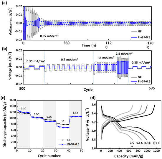 (a) Lithium stripping/plating performance in Li/Li symmetric cells with GF and PI-GF-0.5 separators: (a) cycle stability of 1700 h (500 cycles) at a constant current density of 0.35 mA/cm2 and (b) rate capability in the current density from 0.35 to 2.8 mA/cm2. (c) Rate capability performance of LSBs using the GF and PI-GF-0.5 separators at 2 mgS/cm2, (d) the corresponding charge/discharge profile of PI-GF-0.5.