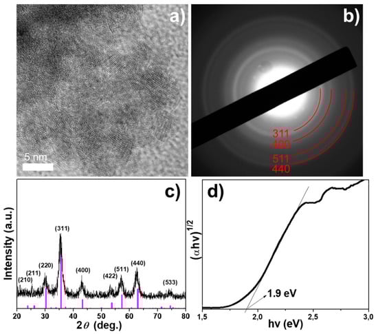 (a) Typical TEM image, (b) SAED pattern, (c) XRD pattern of γ-Fe2O3 NPs. The standard pattern of maghemite phase, γ-Fe2O3, (JCPDS No. 39-1346) is also illustrated for collation (magenta bars) and (d) UV-Vis diffuse reflectance spectra versus energy (hv) for the γ-Fe2O3 NPs.