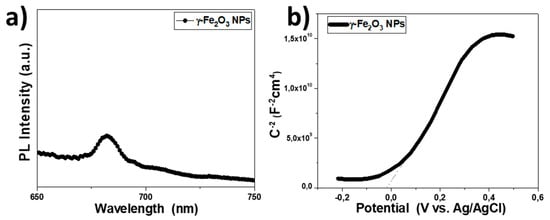 Photoluminescence (PL) was performed at 550 nm excitation wavelength, to investigate the electronic band structure and charge transfer properties of γ-Fe2O3 NPs, as shown in Figure 3a. In the case of pure defect-free crystals, we can expect only the band edge emission in the PL spectra. However, the PL spectrum of γ-Fe2O3 NPs exhibits a weak peak at ~680 nm, which is a higher wavelength than band edge emission This is ascribed to defect levels in the forbidden energy gap of the nanocrystals. Electrochemical impedance spectroscopy (EIS) was then used to investigate the energy levels of γ-Fe2O3. The resulting Mott-Schottky plot and the corresponding fit of the linear portion of the inverse square space-charge capacitance (1/Csc2) as a function of potential (E) for γ-Fe2O3 NPs are shown in Figure 3b. It is apparent that the γ-Fe2O3 shows a positive linear slope, indicating n-type conductivity, where electrons are the majority carriers. Using extrapolation to 1/CSC2 = 0, the flat-band potential (EFB) calculated for γ-Fe2O3 NPs was 0.19 eV vs. NHE (pH = 7). Based on the EFB value and optical band gap (as obtained from UV–vis/NIR reflectance data, Figure 2d), the energy band edges for Fe2O3 are CB: −4.28 eV and VB: −6.18 eV vs vacuum, respectively (Figure 4b). For heavily n-type doped semiconductors such as γ-Fe2O3, it is quite reasonable to assume that the EFB level lies very close to the CB edge. Typically, for many n-type semiconductors, the CB edge is about 0.1–0.3 eV higher than the EFB potential. Thus, the position of the valence band (VB) edge was estimated from EFB–Eg.