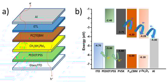 In order to test the effectiveness of γ-Fe2O3 nanoparticulate ETL for inverted structured PVSCs, completed devices were fabricated based on the general inverted device structure ITO/PEDOT:PSS (~30 nm)/CH3NH3PbI3 (~300 nm)/ETL/Al (~100 nm), where the three different ETLs under investigation were compared: PC(70)BM (~70 nm), PC(70)BM/AZO (~40 nm) and PC(70)BM/Fe2O3 (15 ± 5 nm). A schematic representation of the device structure is shown in Figure 4a. The exact fabrication steps and materials used are described in detail in the Experimental Section. The use of γ-Fe2O3 in conjunction with PC(70)BM was found to have little impact on the PCE of p-i-n structured devices since the PCEs were comparable both to PC(70)BM as well as PC(70)BM/AZO. This is further highlighted in the energy level diagram shown in Figure 4b, which is based on measured values of γ-Fe2O3 with EIS and the literature respectively [39,42]. The representative values of PV parameters from a total of 10 devices from each structure, that described in detail above, are summarized in Table 1.
