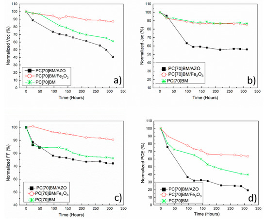 From the lifetime plots, there are some considerable differences between the behavior of the three different (top electrode) inverted PVSCs device architectures. The PV parameters of the PVSCs incorporating γ-Fe2O3 within the top electrode (PC(70)BM/γ-Fe2O3/Al) show considerable improvement in stability compared to devices based on PC(70)BM/Al and PC(70)BM/AZO/Al top electrode. Specifically, PC(70)BM/Fe2O3/Al based devices have T80 (the time the PCE reached 80% of its initial fabrication value) at 100 h of operation and has even retained 70% of their PCE after 300 h of testing, whereas devices with PC(70)BM/Al have T80 at 24 h and the PCE settled at the lowest value of 40% of their original PCE when the aging test has reached 300 h. The devices with PC(70)BM/AZO/Al have dropped to 70% at the first 24 h of aging, reaching below 40% at the 100 h mark and have settled even lower at 15% when the aging test has reached the 300 h. Figure 5 shows that Jsc in the PC(70)BM/AZO/Al-based inverted PVSCs shown the strongest drop under the heat accelerated lifetime condition presented within this paper.