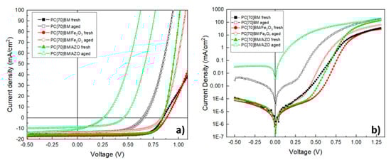 Figure 6a depicts the illuminated J-V characteristic for the three device architectures. The Voc change with respect to aging is very clearly observed. In particular, the device based on PC(70)BM/AZO/Al shows a very sharp drop to Voc, indicated by the shift of the J-V curve to the left. There is also a very significant sign of hysteresis in this device which could be attributed to charge traps or ion migration manifesting through the aging test [44]. Both inverted PVSCs architectures using PC(70)BM/Al and PC(70)BM/Fe2O3/Al show negligible signs of hysteresis. However, the devices without γ-Fe2O3 interface modification (PC(70)BM/Al) show a significant drop to Voc (although not as severe as in PC(70)BM/AZO/Al-based inverted PVSCs), while inverted PVSCs using PC(70)BM/Fe2O3/Al provide clearly more stable Voc values under heat accelerated lifetime conditions. Dark J-V plots are shown in Figure 6b. From the dark JV plots the series resistance (Rs and Shunt resistance (Rsh) were estimated (Table 2). The devices with PC(70)BM/AZO/Al top electrode show significantly reduced Rsh from 36.26 to 5.56 kΩ and increased leakage current after aging compared to the other two top electrode architectures under investigation. Furthermore, the diode characteristic is completely lost in devices with PC(70)BM/AZO/Al top electrode. In comparison, the device with PC(70)BM/Al has also shown a decrease to Rsh from 37.04 to 11.24 kΩ and increase in leakage current which is not as severe as the PC(70)BM/AZO/Al-based inverted PVSCs. Importantly, the inverted PVSCs with PC(70)BM/Fe2O3/Al top electrodes show almost no change after aging regarding Rsh and leakage current (a parameter which is shown the quality of the inverted PVSCs incorporating the proposed γ-Fe2O3 interface modification). Both devices with PC(70)BM and PC(70)BM/Fe2O3 ETLs seem to retain the diode characteristic after aging. This trend follows the observation of Voc drop, where devices with decreased Rsh and increased leakage current also show a proportional drop to their Voc.