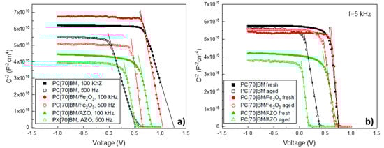 (a) Mott Schottky measurements of fresh devices at f = 100 kHz and f = 500 Hz and (b) fresh and aged devices at f = 5 kHz.