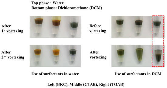 Phase transfer of AgNSs from water to dichloromethane by different cationic surfactants (BKC, CTAB, and TOAB).