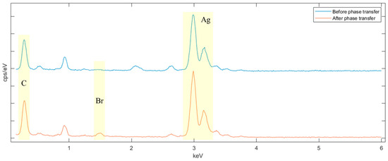 To obtain elemental and crystallographic information from the AgNSs before and after phase transfer, approximately 2 to 3 µL of the samples (AgNSs and transferred AgNSs) were deposited onto TEM grids with a carbon film and dried on a paper filter. The spheres were characterized by FEI TECNAI G2 F20 Super-Twin TEM fitted with a Schottky field emission gun, a 2k × 2k Gatan CCD camera, and an Oxford windowless energy dispersive X-ray spectroscopy (EDX) detector (Oxford X-MaxN TSR) with a collection solid angle in the range of 0.3 to 0.7 steradians. The elemental analysis was performed in the area of agglomerated AgNSs and transferred AgNSs at a 200-kV accelerating voltage, and the collected EDX spectra were exported from Oxford AZtec software. In addition to the chemical elements from the TEM-EDX system, electron diffraction patterns were also taken from the AgNSs and transferred AgNSs at a camera length of 200 mm.