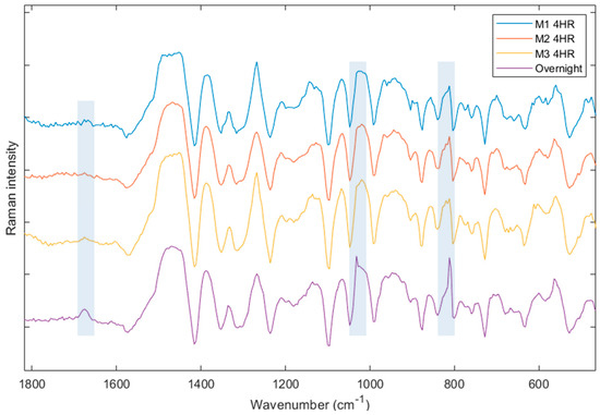 SERS spectra of MeSA VOCs according to the collection times. M1 4HR: Mixture with 1 mg of polymer for 4 h, M2 4HR: Mixture with 2 of mg polymer for 4 h, M3 4HR: Mixture with 3 mg of polymer for 4 h, overnight: Averaged over three concentrations overnight. MeSA standard Raman spectrum is available in the Supplementary Materials, Figure S1.