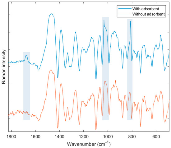 The effect of adsorbent on SERS spectra of MeSA VOC. MeSA standard Raman spectrum is available in the Supplementary Materials, Figure S1.