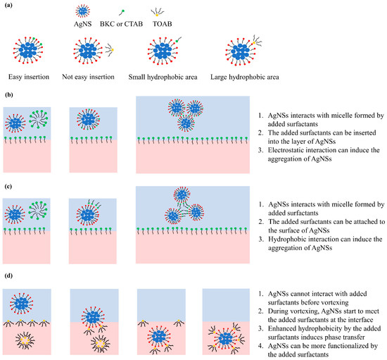 Schemes of several possible interfacial phenomena for phase transfer. (a) Effect of the hydrophobic tail area according to the surfactants. (b) One possible interaction between AgNS and the added surfactant with a small hydrophobic tail (BKC, CTAB) in the water phase (Blue: water, Pink: dichloromethane): Surfactant insertion into AgNS. (c) Another possible interaction between AgNS and the added surfactant with a small hydrophobic tail (BKC, CTAB) in the water phase (Blue: water, Pink: dichloromethane): Surfactant attraction to AgNS. (d) Successful phase transfer of AgNS by the added TOAB dissolved in dichloromethane.