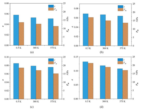 where L is the indentation load, h is the indentation depth, a is the R is the radius of the indenter, and the so-called indentation modulus M describes the elastic response of materials, which can be obtained by fitting the L-h curves in elastic deformation. The fitted indentation modulus, representing the material’s elastic response under nanoindentation, decreases with the increase of temperature, as shown in Figure 2c. The fluctuation of the L-ε and Pm-ε curves become larger at an elevated temperature due to intensive atomic thermal vibration. Moreover, the load and contact pressure decrease monotonously with the increase in temperature as expected, which is more remarkable at a large ε. This implies a decreased hardness with the increase in temperature. Overall, Pm continuously increases and tends to be a stable value as a large ε is reached at all temperatures.