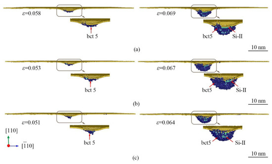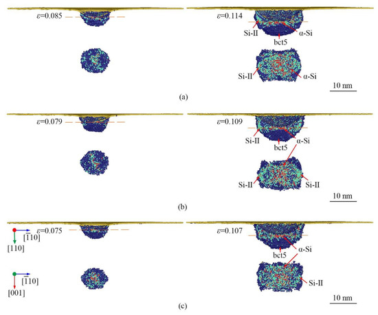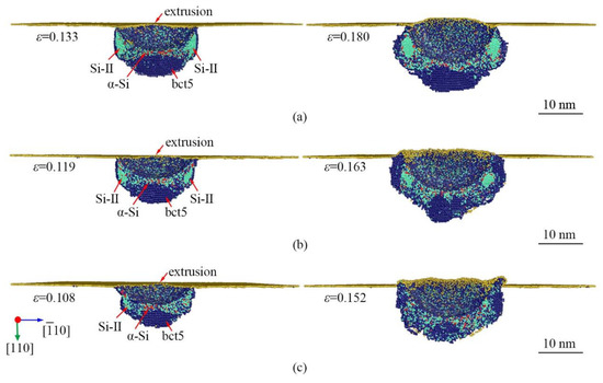The microstructures of (100)Si induced by nanoindentation at a large indentation strain depending on temperature are displayed in Figure 9. Our MD simulations predict several featured structures including HPPT region surrounding indenter, extrusion of α-Si in the surface, dislocations, and crack in the high-pressure phases/Si interface, which involves almost all the observed structure features of Si induced by nanoindentation and is coincided with the experiment results [14,32,33]. Bct5, Si-II, and α-Si are high-pressure phases. α-Si surrounds indenter, and the bct5 is on the edge of the transformation regions. The volume of Si-II is very small, especially at an elevated temperature. The volume of α-Si is relatively large and increases with the increase in temperature. In comparison to (100)Si, (110)Si and (111)Si have large α-Si region but small Si-II region. The detailed structure features depend strongly on the crystallographic orientation. Consequently, MD simulations render us a complete scenario of structure changes in Si induced by nanoindentation using a spherical indenter.