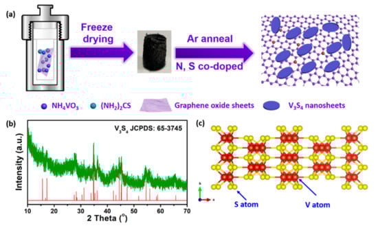 (a) Schematic illustration of preparation process of VS/NSG; (b) XRD pattern of as-prepared VS/NSG; (c) the structure of V3S4 along the c-axis.