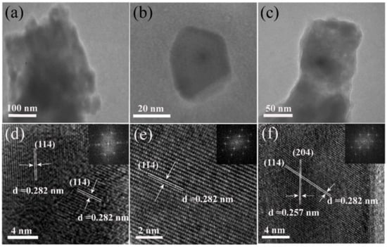 The XRD patterns of MAPbI3 nanoplates, nanocubes, and nanorods dried at different temperatures are shown in Figure 4. All the diffraction patterns match well with the standard pattern of MAPbI3 perovskite in the tetragonal phase with a space group of I4/mcm (ICSD card No.250739), suggesting that the drying temperature did not affect the lattice structure of the material. In addition, we noted that the nanoplates and nanocubes dried at 70 °C, and the nanorods dried at 50 °C, have stronger diffraction peaks, indicating that these materials have higher crystallinity. Figure 5 shows the TEM, the high resolution TEM (HRTEM), and the fast Fourier transformation (FFT) images of the MAPbI3 nanocrystals. In the HRTEM image of a MAPbI3 nanoplate (Figure 5d) and the FFT image (inset of Figure 5d), the interplanar distances of 0.282 nm, which corresponded to the (114) crystal faces of the tetragonal MAPbI3 structure, were clearly observed. These results may indicate that the (114) crystal plane growth direction was forbidden during the growth process of the nanoplates. In nanocubes (Figure 5e), the (114) crystal plane with an interplanar distance of 0.282 nm was also observed. However, in nanorods (Figure 5f), two interplanar distances of 0.257 nm and 0.282 nm were identified, which corresponded well with the (204) and the (114) crystal faces of the tetragonal MAPbI3 structure. As the (204) crystal face is parallel to the nanorods growth direction, and the [010] direction was perpendicular to the (204) crystal faces, it can thus be deduced that the nanorods may grow along the [010] direction.
