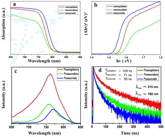(a) Visible absorption spectrum, (b) direct bandgap tauc plots, (c) steady-state photoluminescence, and (d) time-resolved photoluminescence of MAPbI3 nanoplates, nanocubes, and nanorods.
