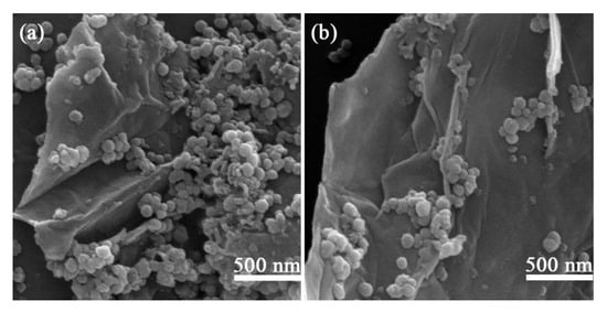 Scanning electron microscope (SEM) image of (a) BT@ZnPc-GO-1 and (b) BT@ZnPc-GO-2.