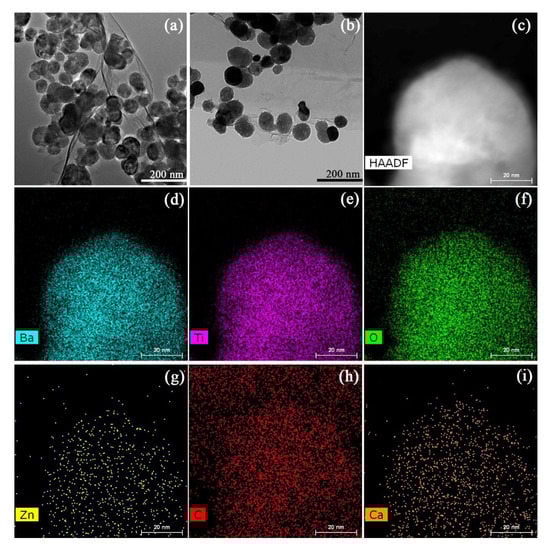 In addition, to further investigate the microstructure and the component of the nanoparticles, the TEM and the TEM energy dispersive spectroscopy (EDS) mapping images of BT@ZnPc-GO nanoparticles are shown in Figure 2. As can be seen in Figure 2a, the graphene oxide nanosheets are well coated by BT@ZnPc nanoparticles, which densely and evenly deposited on both sides of these sheets to form a sandwich-like composite structure. Moreover, it can clearly be seen that BT@ZnPc-GO-2 has more uniform distribution and the graphene oxide nanosheets were well coated by BT@ZnPc nanoparticles, which are shown in Figure 2b. The scanning transmission electron microscope (STEM) image and of BT@ZnPc-GO-1 EDS mapping images of Ba, Ti, O, Zn, C and Ca are exhibited in Figure 2c–i. It is obvious that the color distribution points of all different elements are evenly present in BT@ZnPc-GO-1, which indicated that the BT@ZnPc nanoparticles are homogeneously deposited on the graphene oxide sheets. Meanwhile, the EDS spectrum of calcium (Figure 2i) shows that calcium is almost exclusively present on the surface of the BT@ZnPc nanoparticles, indicating that calcium ions promote the electrostatic attraction between BT@ZnPc nanoparticles and GO nanosheet in this system.