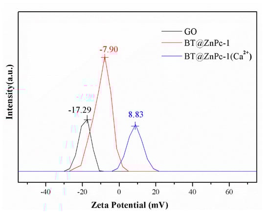 Figure 3 shows the intensity of light scattering as a function of the zeta potential of GO, BT@ZnPc-1 and BT@ZnPc-1 after modified by Ca2+ particles at pH = 7. Zeta potential refers to the potential of the Shear Plane, which is related to the total charge carried by the particles in a particular medium and the peak of the zeta potential represents the type and intensity of charge present after dispersed in solution [23]. It can clearly be seen that the highest light scattering of GO is observed at the zeta potential of −17.29 mV, which is mainly owing to the ionization of oxygenated functional groups in a high polar solvent like water, and the pristine GO would assume slightly negative charge. Moreover, the highest light scattering of BT@ZnPc-1 is −7.90 mV, which is due to the fact that the zinc phthalocyanine in BT@ZnPc is carboxylated, and the –COOH groups on the surface of BT@ZnPc nanoparticles are partially hydrolyzed in an aqueous medium to form some –COO–, making the BT@ZnPc-1 electrostatically negatively charged. However, the modification of calcium ions on the surface of BT@ZnPc nanoparticles will provide a positively charged surface. Therefore, the positively charged BT@ZnPc/Ca2+ nanoparticles interact with negatively charged GO nanosheets to form electrostatically neutral particles.