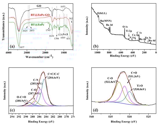(a) Fourier transform infrared spectroscopy (FTIR) spectra of GO, BT@Znpc-GO-1 and BT@ZnPc; (b) X-ray photoelectron spectroscopy (XPS) spectrum of BT@ZnPc-GO-1; (c) XPS C1S spectra of BT@ZnPc-GO-1; (d) XPS O1S spectra of BT@ZnPc-GO-1.