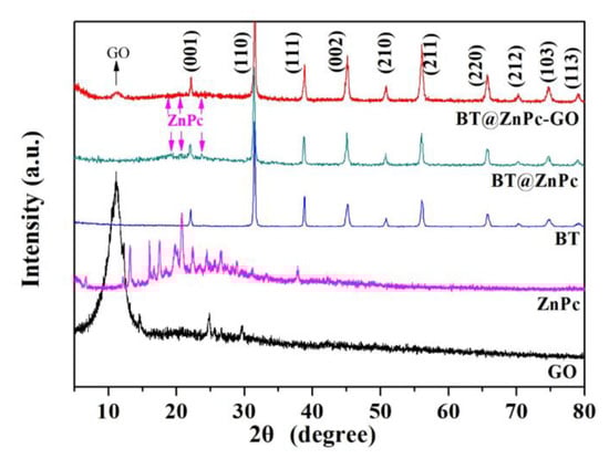 Furthermore, the the XRD patterns of GO, ZnPc, BT, BT@ZnPc and BT@ZnPc-GO are shown in Figure 5. As can be seen from the spectra of BT, BT@ZnPc and BT@ZnPc-GO that the diffraction patterns at 2θ = 22.2°, 31.4°, 38.5°, 45.2°, 50.7°, 56.1°, 65.6°, 74.7° and 79.5° which responding to the (001), (110), (111), (002), (210), (211), (001), (220), (212), (103) and (113), showing the crystal planes of BT exhibiting the cubic phase [26]. Meanwhile, ZnPc exhibits halo peaks from 10°–40° [24]. From the spectra of BT@ZnPc and BT@ZnPc-GO in the figure, it can be found that they have the same diffraction peaks at 10°–40°, which proves the existence of ZnPc in the BT@ZnPc and BT@ZnPc-GO nanoparticles. It is worth mentioning that the same diffraction peak as graphene oxide appears in the BT@ZnPc-GO spectrum, which indicates that graphene oxide has been successfully modified in BT@ZnPc-GO.