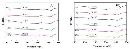 DSC curves of (a) BT@ZnPc-GO-1/PEN films with 1, 3, 5, 10 and 15 wt % of BT@ZnPc-GO-1 and (b) BT@ZnPc-O-2/PEN films with 1, 3, 5, 10 and 15 wt % of BT@ZnPc-GO-2.