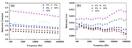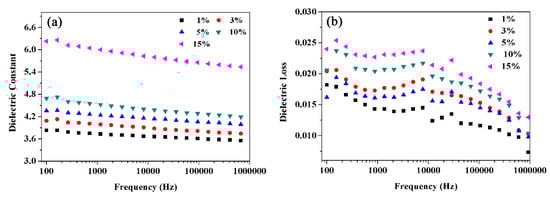 At the same time, the dielectric loss of the nanocomposites shows a similar trend to that of the dielectric constant in this work. It can be seen from Figure 7b that the dielectric loss slightly increased from 0.018 to 0.023 at 1 kHz with the BT@ZnPc-GO-1 contents increasing from 1% to 15%, which is mainly caused by the conductance loss [31]. More importantly, the dielectric loss of all nanocomposites was well controlled at a relatively low level (<0.025), which satisfied the practical application requirements of electronic components.