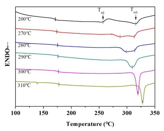 In order to further investigate the crystallization behavior of the nanocomposite films, the BT@ZnPc-GO-1/PEN nanocomposites were annealed at different temperatures (200 °C to 310 °C) for 2 h. The annealed films were cooled to room temperature prior to DSC measurementand all the data related to crystallization properties are summarized on Table 1. Figure 9 shows the DSC curves of nanocomposites after isothermal crystallization for 2 h at different temperatures. As can be seen from the figure, the BT@ZnPc-GO-1/PEN nanocomposites have two melting points (where Tml is 256.35 °C, Tmh was about 314.51 °C). It is interesting that as the isothermal treatment temperature increases, Tmh remains constant and the Tml shows a gradual increasing trend. This is obviously being caused by the newly formed crystalline regions being affected during the heat-treatment process. In addition, the arrangement of macromolecules in the amorphous phase can also result in thickening of the original crystalline regions. However, as the processing temperature increases, more and more macromolecules in the amorphous phase rearrange to form new crystalline regions, resulting in an increase in new crystalline regions and an increase in Tml [31]. As shown in Figure 9, when the heat treatment temperature is further increased and approaches Tml, the macromolecules in the original crystalline region start to move, resulting in disintegration of the crystalline region. The disintegration of the crystalline region leads to a decrease in melting enthalpy. In addition, the BT@ZnPc-GO-1/PEN nanocomposites isothermal treatment at 280 °C for 2 h show the highest melting enthalpy (=15.33 J), which indicated that 280 °C is the best isothermal crystallization temperature in this system. Furthermore, another phenomenon than can clearly be seen in Figure 9 is that as the isothermal processing temperature increases, the Tg of the nanocomposites increases gradually. This is because the crystal limits the motion of the macromolecular backbone of the sample [28].