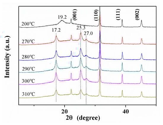 XRD patterns of BT@ZnPc-GO-1/PEN nanocomposite films with 15 wt % BT@ZnPc-GO-1 after isothermal annealing at 200, 270, 280, 290, 300 and 310 °C for 2 h.