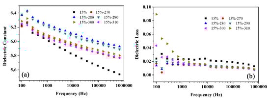 Dielectric constant (a) and dielectric loss (b) of BT@ZnPc-GO-1/PEN films after isothermal annealing at 200, 270, 280, 290, 300 and 310 °C for 2 h.