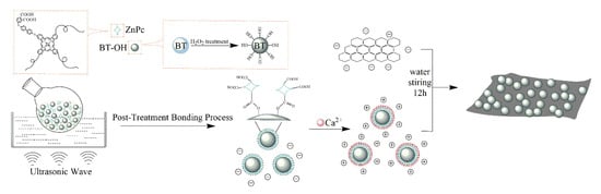 2 g CaCl2 was firstly dissolved in 200 mL deionized water, and then the 100 mg BT@ZnPc nanoparticles were added in the CaCl2 solution with mechanical stirring and ultrasonic wave for 30 min. The obtained solution was filtered and washed by deionized water 3 times to remove excess CaCl2 until the filtrate droplets K2CO3 were added an no turbidity appears, and were washed with deionized water several times. Meanwhile, an appropriate amount of GO was dispersed in 10 mL deionized water by using ultrasonic waves for 30 min and then added into the obtained BT@ZnPc/Ca2+ solution, and the mixture were continuous stirred for 12 h. After filtration, the solid product was dried in a vacuum oven at 80 °C for 12 h to obtain the BT@ZnPc-GO nanoparticles. The specimens of GO of 5 and 10 mg are named BT@ZnPc-GO-1 and BT@ZnPc-GO-2, respectively. The corresponding preparation diagram is shown in Scheme 2.