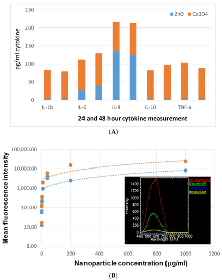 Figure 1 shows a comparative cytokine panel for an 80 ug/mL dosage of either ZnO or Co3O4 NP after 24 or 48 h in the left or right bar respectively. With the exception of IL-8, the induction of cancer promoting or tolerogenic cytokines was in the order; Co3O4 NP > ZnO NP. Dose-response is shown in Figure 1 indicating maximal effect occurs at about 80 ug/mL NP concentration in which case the induction of cytokine begins to top out. Hyperspectral imaging (HSI) experiments confirmed Co3O4 intracellular uptake (data not shown) and the summary plot of this data is shown in the inset in Figure 1B.
