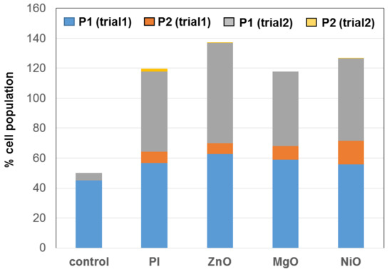 Briefly, this assay was also conducted similarly to what we previously described [10]. Mouse spleens were collected from donor mice from the laboratory of Dr. Sherri Fleming (Kansas State University Biology Department). The spleen was isolated and minced in buffer, the cells were separated from the tissue fragments and incubated in PBS buffer containing a 20 μg/mL suspension of the nanoparticles after which the cells were stained with propidium iodide and analyzed by flow cytometry (BD FACSDiva, Warwick, RI, USA) by the Kansas State University Veterinary Diagnostic Laboratory. The cells separated into two populations in the all event forward scatter (FSC-A) and gated in the P1 and P2 channel (PE-A). The ratio of these two populations from two different trials is plotted in Figure 2.
