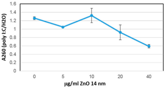 Poly inosinic:poly cytidylic acid (poly I:C) is an RNA immunogen used widely in cancer research [3,4,5]. In a relatively recent report we reviewed the molecular cell immunology of the metastatic tumor niche and the cytokines which are thought to regulate it [3]. We previously characterized the interaction of poly I:C to ZnO to form poly I:C-ZnO nano-complexes [34] and consistent with another recent study [4], demonstrated inhibition of experimental melanoma in B16F10-BALB/c mice by poly I:C-ZnO nano-complexes relative to ZnO NP or poly I:C controls [13]. Analysis of the poly I:C-ZnO-treated tumors relative to control mice receiving sham PBS intratumoral injection in this immuno-competent B16F10-BALB/c mouse model demonstrates significant antitumor cytokine response (Table 1). In the Figure 3, binding isotherm of poly I:C onto 14 nm zinc oxide (ZnO) nanoparticle measured by the loss in UV absorbance at 260 nm as a function of increased mass per volume (NP) added is shown. This data is in concordance with other measurements in which we have studied the poly I:C nanobio interface to ZnO NP [34]. The table below summarizes cytokines which are thought to regulate immunology of the melanoma metastatic tumor microenvironment and their putative role [3]. Tumors exposed to poly I:C-ZnO had from a 5.8-fold to as much as a 148-fold increase in these antitumor cytokines, the significance of which was demonstrated by Cohen’s d effect size [15,16].