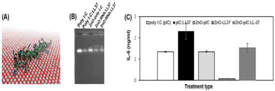 LL-37 is an antimicrobial peptide currently in clinical trials as an intratumoral injection immuno-therapy against melanoma [35]. LL37 binds poly I:C and is thought to partially inhibit its TLR3 based signaling in some cells of the immune system as well as BEAS-2B transformed lung cells [26,36]. Molecular dynamic simulations indicated LL-37 interacts with the surface of ZnO NP and we were able to use its RNA binding properties to assemble RNA-peptide nanoparticle (RNP) onto ZnO NP testing the ability of these novel co-conjugates to inhibit BEAS-2B interleukin-6 (IL-6) expression by ELISA (Figure 4).