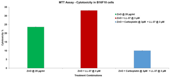 This assay was conducted as we previously described [27]. Briefly 8000 B16F10 cells were added per well of a 96-well plate and treated with 20 mg/mL ZnO-NP loaded in the presence of 3 mM LL37 or carboplatin sedimented from those suspensions and taken up in 10% FBS/DMEM and added to the cells. The cells (n = 3 wells/treatment group) were incubated for 96 h and assayed by MTT on a plate reader (Molecular Devices Corp.) at 562 nm absorbance. The plotted bars are the means with standard error shown.