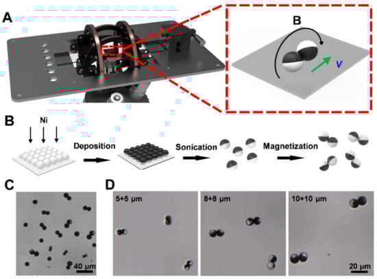 The preparation process of the Janus microdimer is shown in Figure 1B. The 5, 8 and 10 μm silica microspheres were first washed three times with deionized (DI) water. Then the SiO2 microspheres were placed onto glass slides and deposited by an ion-sputtering apparatus (K575XD, Emitech, Laughton, England) at 90° angle of incidence to be coated with a 100 nm nickel layer [12,64]. Different thickness and coverage area of the Ni layer can be obtained by changing deposition time and the angle of incidence. After a brief sonication in ultrapure water, the Janus microspheres were released from the glass slide and dispersed into ultrapure water. The Janus microspheres were stored in ultrapure water until use.