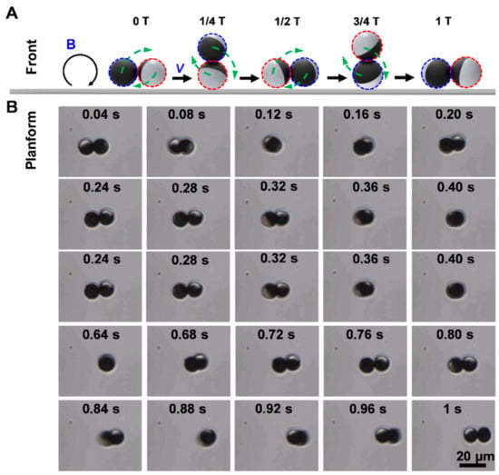 Propulsion of microdimer swimmer under a rotating uniform magnetic field. (A) propulsion mechanism of microdimer in a rotating magnetic field; (B) time-lapse optical microscopy images depicting the motion of a microdimer within ~1 s.