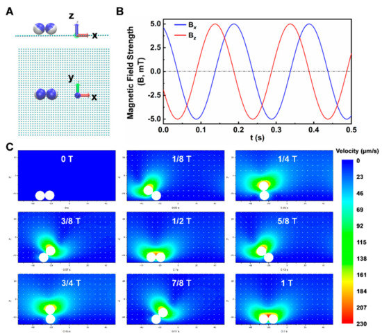 Fluidic interaction is another critical factor for triggering the controllable propulsion of microdimer swimmers [65]. Janus particles will experience a drag force due to the difference of velocity between particles and surrounding fluids. The fluidic interaction can keep the microdimer swimmers in contact with the wall surface continuously, and transform the rotation movement of microdimer swimmers into a linear movement along the water/wall interface. As shown in Figure 3, the fluidic velocity field induced by a rotating microdimer swimmer adjacent to the wall surface has been simulated and analyzed. All the simulations were performed within the framework of a large-scale atomic/molecular massively parallel simulator (LAMMPS), which is a highly parallelized solver for molecular dynamics simulations [66]. The Lattice Boltzmann method (LBM), which is an efficient and accurate method for Newtonian flow [67], was employed to solve Navier–Stokes equations. The LBM solver was directly embedded into LAMMPS as a fix_lb_fluid [68], where fix is a kind of class offered by LAMMPS to apply external control on the simulation system. Each Janus microsphere was treated as a sphere with a point dipole shifted from the geometric center of microsphere (Figure 3A) [69]. The anisotropic magnetic susceptibility was scaled by the experimental hysteresis curve and the dipole–moment shift was determined by matching the experimentally observed bond angle of the zigzag chain in a static magnetic field. As shown in Figure 3B, magnetic interactions were determined at each time step by solving the linear system of equations for each microsphere’s magnetic moment as a function of the field produced by the other microspheres and the spatially uniform, time-dependent external field. The movement of a magnetic Janus microsphere was captured by solving Newton’s second law equation, under the influence of both hydrodynamic force and magnetic force (the field strength at 5mT and frequency at 5 Hz).