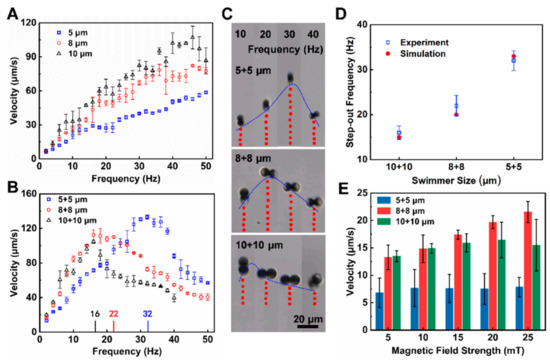 Then the effect of frequency of the rotating magnetic field on the velocity of microdimer swimmers was investigated experimentally as well. The driving frequency increased from 2 to 50 Hz with a magnetic field strength of 5 mT, as shown in Figure 4B. For a 5 + 5 μm microdimer swimmer, the speed increased linearly with the driving frequency and reached a maximum velocity of 133 μm·s−1 (≈13.3 body length s−1) at 32 Hz, further increasing the frequency reduced the velocity. Such a maximum synchronized frequency is called step-out frequency which was also commonly observed for many other types of micromotors in rotating and oscillating magnetic fields [44,70,71]. The reason we speculate for this variation is the occurrence of out-of-step phenomenon and the increase in drag caused by the increasing speed. Furthermore, the 8 + 8 and 10 + 10 μm microdimer swimmers obtained the highest velocities of 110 μm·s−1 (≈6.9 body length s−1) and 89 μm·s−1 (≈4.5 body length s−1) at 22 and 16 Hz, respectively. This result illustrates that the step-out frequencies of the larger microdimer swimmer are lower than those of the smaller microdimers under the same conditions, which is similar to the performance of microdimers in an oscillating magnetic field [44]. Figure 4C displays the trajectories of microdimer swimmers in different sizes at driving frequencies from 10 to 40 Hz over a period of 1 s. The microdimer swimmers continuously moved linearly aligning on rotation direction of the magnetic field, and higher speeds were achieved near the step-out frequency. In order to verify the variation law of this step-out frequency, the microdimer swimmer speed under different swimmer sizes and driving frequency was simulated and the step-out frequency was analyzed, as shown in Figure 4D. In the simulation, the step-out frequencies of the 5 + 5, 8 + 8, 10 + 10 μm microdimer swimmers were 33, 20 and 15 Hz, respectively, which was in good agreement with the experimental results.