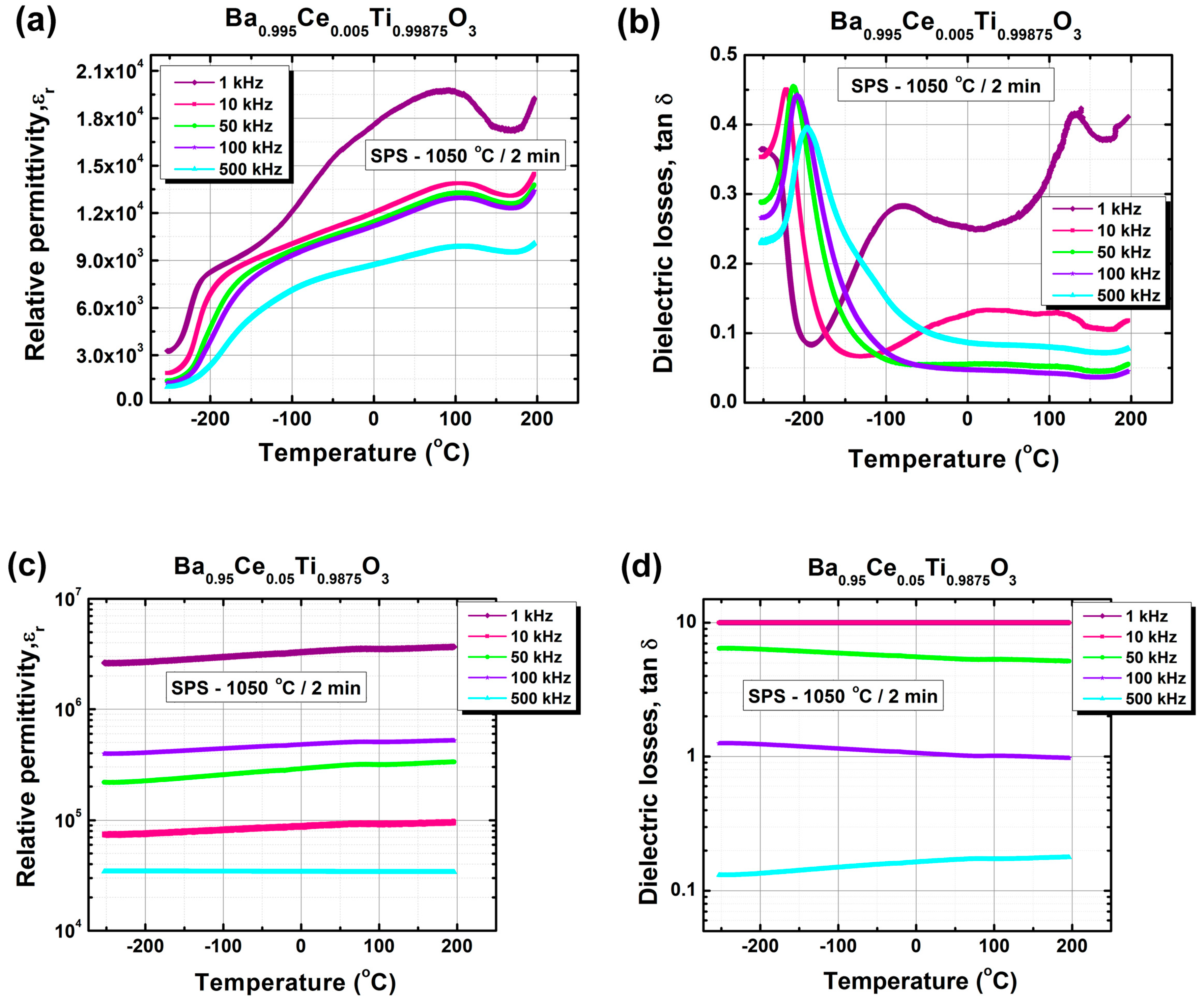 - Li, B.; Wang, X.; Li, L.; Zhou, H.; Liu, X.; Han, X.; Zhang, Y.; Qi, X.; Deng, X. Dielectric properties of fine-grained BaTiO3 prepared by spark-plasma-sintering. Mater. Chem. Phys. 2004, 83, 23–28. [Google Scholar] [CrossRef]