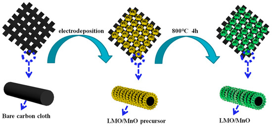 Electrochemical synthesis is a convenient and inexpensive way for the preparation of perovskite oxide coating. However, for La-based perovskites LaBO3 preparation, the greatest weakness lies in the nonparticipation of La ions in any redox process reaction during the reaction. Thus, bath solution with a high La/B ratio is necessary for the steady electrodeposition of LaBO3 [29]. In addition, BOx can strengthen the adhesion between the substrate and the active layer. BOx penetrates into the carbon fiber along the grain boundary and acts as a “pinning” to enhance the compatibility, which is beneficial to improve the life and stability of the electrode [12,28]. Therefore, for the LMO/MnO composite material obtained in the present work by cathodic deposition and annealing, the presence of MnO can increase the adhesion of LMO to the substrate. A schematic diagram showing the fabrication of LMO/MnO on a flexible carbon cloth is shown in Figure 1. A precursor film composed of mixed metal hydroxide is firstly obtained on the carbon cloth after electrodeposition. Then the precursor transforms into LMO/MnO composite material after a thermal treatment. The electronic photograph in Figure S1 shows the excellent flexibility of the obtained carbon cloth-supported LMO/MnO electrode.