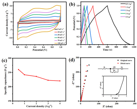 The charge and discharge curve (GCD) is also an important parameter to measure the practicality of supercapacitors. Figure 6b shows GCD curves of LMO/MnO electrode at different current densities, all curves are basically triangularly symmetrical, which ensure high rate performance of LMO/MnO electrode. As the current density increases, the specific capacitance shows a downward trend, due to the increase of internal resistance. The obtained capacitance for single electrode with the variation of current density are shown in Figure 6c. According to the discharge curves at current densities of 0.5, 1, 2, 3, and 4 A·g−1, the corresponding capacitances are 260, 242, 236, 222.6, and 220.4 F·g−1, respectively. Comparatively, the GCD curves of LMO/MnO materials in bath solution with different La/Mn ratios (200:1 and 400:1) are shown in Figure S5. The specific capacitances are calculated as 76 F·g−1 (0.5 A·g−1) and 134 F·g−1 (0.5 A·g−1), respectively. It can be concluded that the uniform deposition morphology is favorable for the optimization of specific capacitance. A typical Nyquist plot of the LMO/MnO electrode in 0.5 M Na2SO4 solution is shown in Figure 6d. There are three parts make up of this EIS diagram (see the inset in Figure 6d). At higher frequency, the x-intercept with the initial curve is called the effective series resistance (Rs) [47,48]. It is commonly used as the bulk resistance of electrochemical systems, which includes electrolyte and internal resistance of the electrode. The second part is the semicircle of the intermediate frequency region, and its diameter corresponds to the charge transfer resistance (Rct) of the electrode/electrolyte interface [49,50]. The third part of the EIS diagram is the linear portion of the low frequency region, representing the proton diffusion in the active material, as a Warburg impedance Wo in the equivalent circuit [51]. Impedance spectroscopy has been simulated by appropriate equivalent circuit diagram. The ohmic resistance (Rs) is calculated as 1.61 Ω, suggesting ion transport between LMO/MnO electrode and electrolyte is less hindered. Rct is calculated as 0.10 Ω, indicating that the charge transfer resistance is very low at the open-circuit potential, the electron activity in the electrode material is high and the conductivity of the material is remarkable. In addition, ion diffusion impedance Wo (Warburg impedance) characterized in the low frequency region is 1.26 Ω, suggesting good behavior of the electrode. The determined value of the constant phase element CPE (instead of double layer capacitance) is 3.02 µF, showing good capacitance behavior. The analysis of Nyquist diagram indicates the low resistance of LMO/MnO electrode, confirming the excellent electrochemical capacitance behavior.