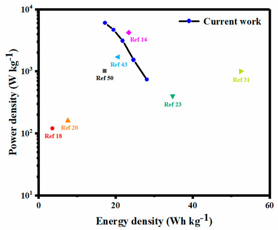 Accordingly, the mass energy density E (Wh·kg−1) and power density P (W·kg−1) of supercapacitor cell can be expressed according to Equations (4) and (5) [32]: