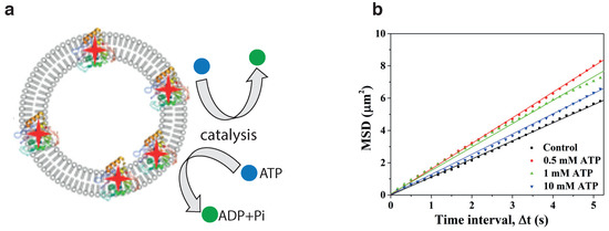 (a) Scheme of a liposome constructed with L--phosphatidylcholine (EPC) and decorated with fluorescently labelled membrane-bound ATPases catalysing the conversion of adenosine triphosphate (ATP) (in blue) to adenosine diphosphate (ADP) (in green) plus a phosphate ion (Pi); (b) plots showing the mean squared displacement (MSD, see Section 5.1) of ATPase tagged vesicles for different ATP concentrations as measured by optical tracking. Figures are reproduced from [35], with permission from American Chemical Society, 2019.