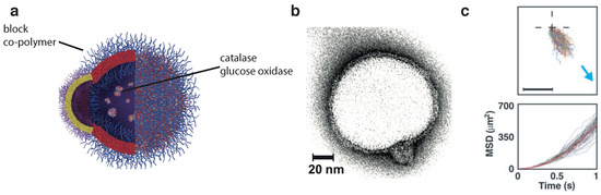 Some researchers have endowed polymersomes with self-propulsion [8,9]. Such active vesicles are propelled by self-generated chemical gradients that result from asymmetric catalytic reactions occurring in the lumen of the vesicle. Joseph et al. created catalytic asymmetric polymersomes (Figure 3a,b) by encapsulating glucose oxidase and catalase in polymersomes made out of two distinct copolymers that phase-separated into two distinct domains [8]. The encapsulated enzymes work in tandem transforming glucose to D-glucono-d-lactone and water, without the formation of potentially toxic reactive oxygen species (ROS) such as hydrogen peroxide and gaseous oxygen. The resulting self-propelled polymersomes of 50 nm radius exhibit taxis within glucose gradients (Figure 3c) and have even been used in complex biological environments, notably enabling a four-fold increase in penetration of the blood brain-barrier compared with passive vesicles.