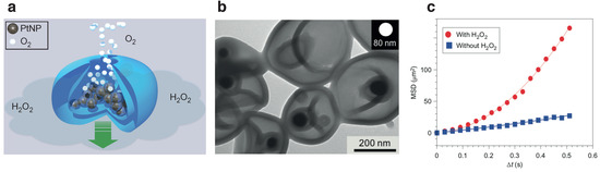 (a) Stomatocytes formed by the self-assembly of block copolymers polyethylene glycol-polystyrene (PEG-PS). Self-propulsion is achieved by entrapping catalytically active nanoparticles (grey, PtNPs) and immersing them in fuel (H2O2). (b) TEM images show the entrapment of 90 nm PtNPs in stomatocytes; (c) average MSD of the platinum-filled stomatocytes before and after the addition of H2O2. Figures have been reproduced from [9], with permission from Springer Nature, 2012.