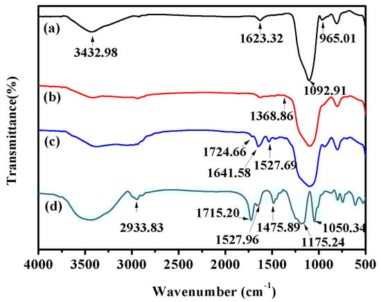 After modification, SiO2-OH, SiO2-APTES, SiO2-APTES-Br, and SiO2-g-SPMA were obtained and their physiochemical properties and microstructures were characterized by FTIR, XPS, TGA, SEM, TEM, and ESEM. Figure 1a shows the FTIR spectrum of activated silica (SiO2–OH), peaks at 800 and 1100 cm−1 for Si−O, 965 cm−1 for Si−OH, and the broad range of 3200 to 3700 cm−1 for OH are observed in SiO2–OH. After surface modification with APTES, the new peak at 1385 cm−1 assigned to the –CH2, the stretching of C–H at 2933 cm−1 assigned for alkanes, and the bending of N–H at 694 cm−1 were detected (Figure 1b). Simultaneously, the Si−OH peak at 965 cm−1 was significantly decreased. The above results indicated that APTES was successfully grafted onto the silica through chemical bonding. In Figure 1c, a new peak at 1724 cm−1 was attributed to the C=O group from amide, indicating that the initiator 2-bromoisobutyryl bromide (BIBB) was successfully immobilized on the surface of silica. In the spectrum of SiO2-g-SPMA (Figure 2d), two new bands at 1175 and 1050 cm−1 were attributed to the S=O stretching vibration of sulfonate groups from the SPMA monomer [31,32], confirming the successful grafting of pSPMA brushes onto the surface of SiO2 nanoparticles via ATRP method.