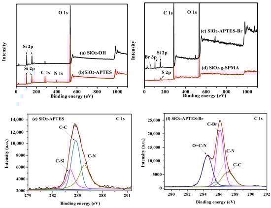 (a–d) The broad scans spectra of SiO2-OH, SiO2-APTES, SiO2-APTES-Br and SiO2-g-SPMA; (e) C 1s spectrum for SiO2-APTES; and (f) C 1s spectrum for SiO2-APTES-Br.